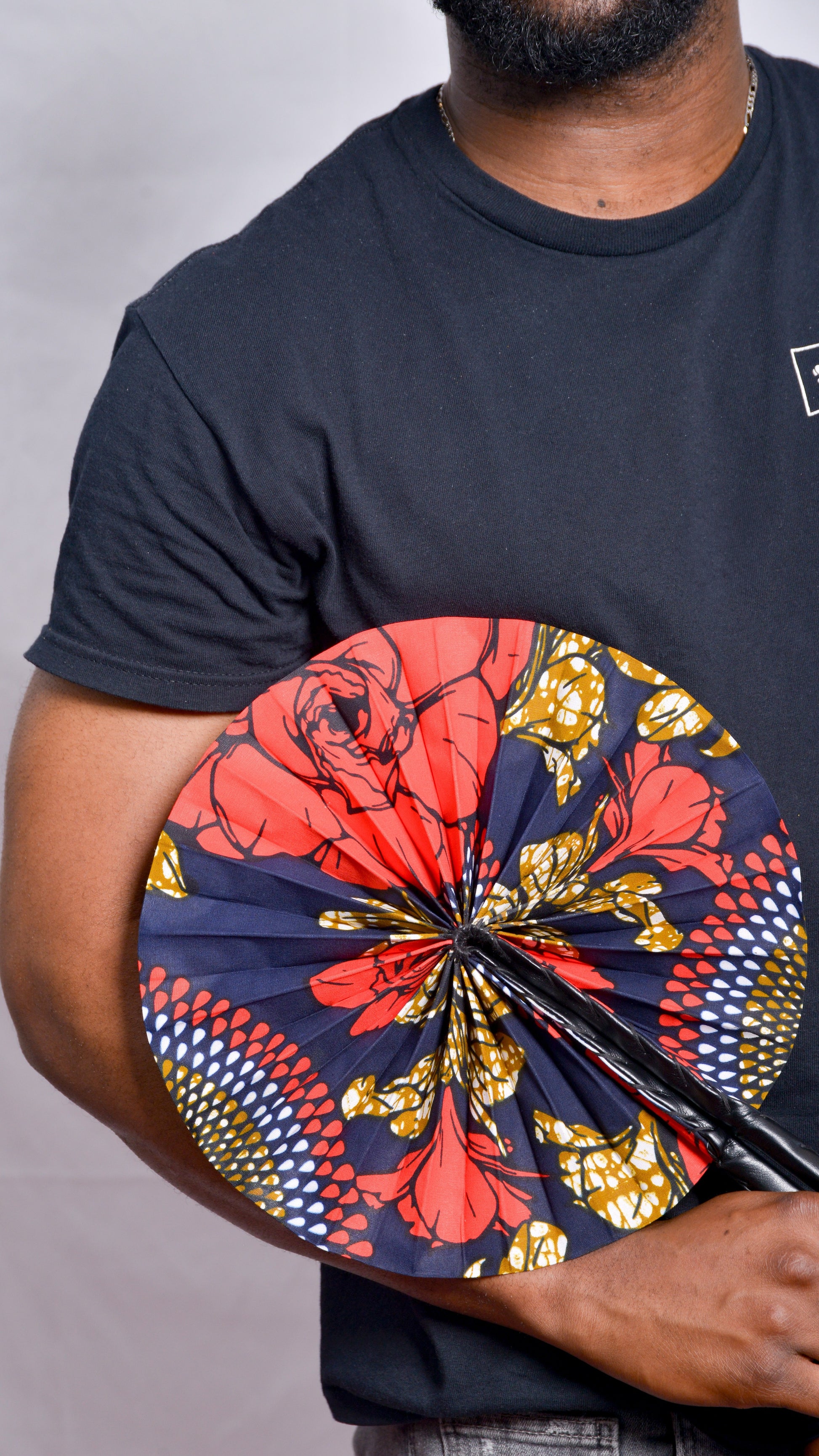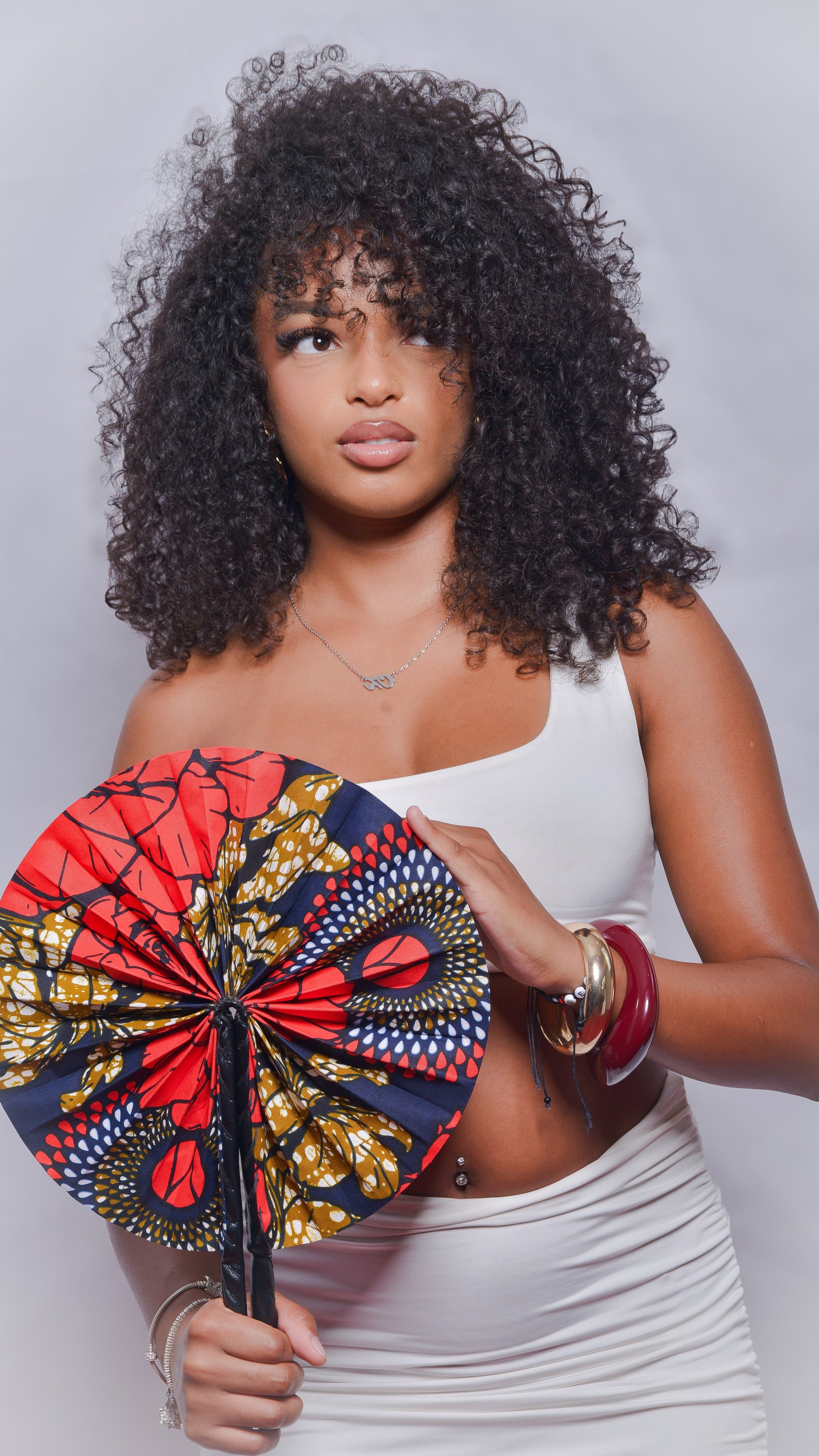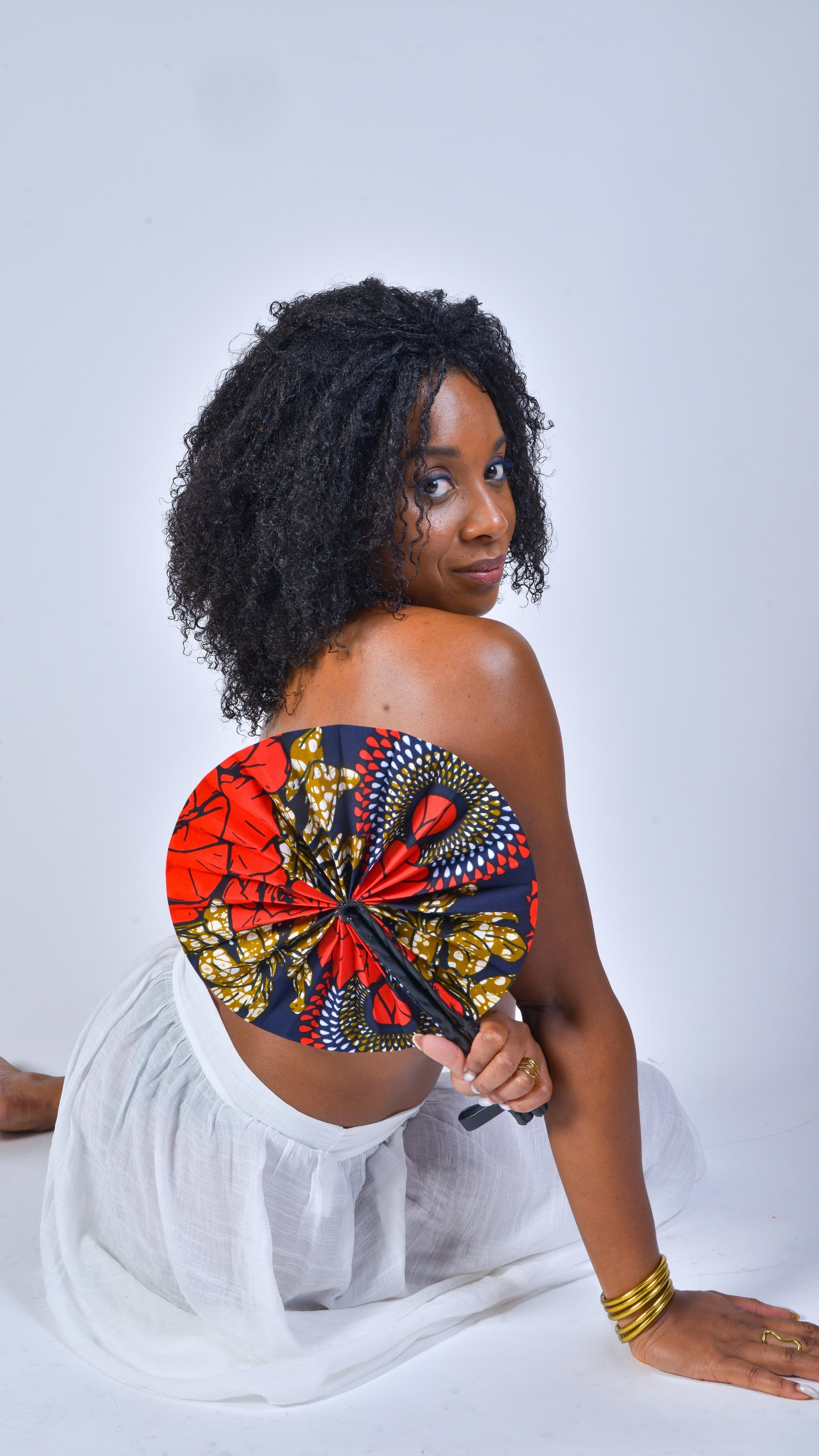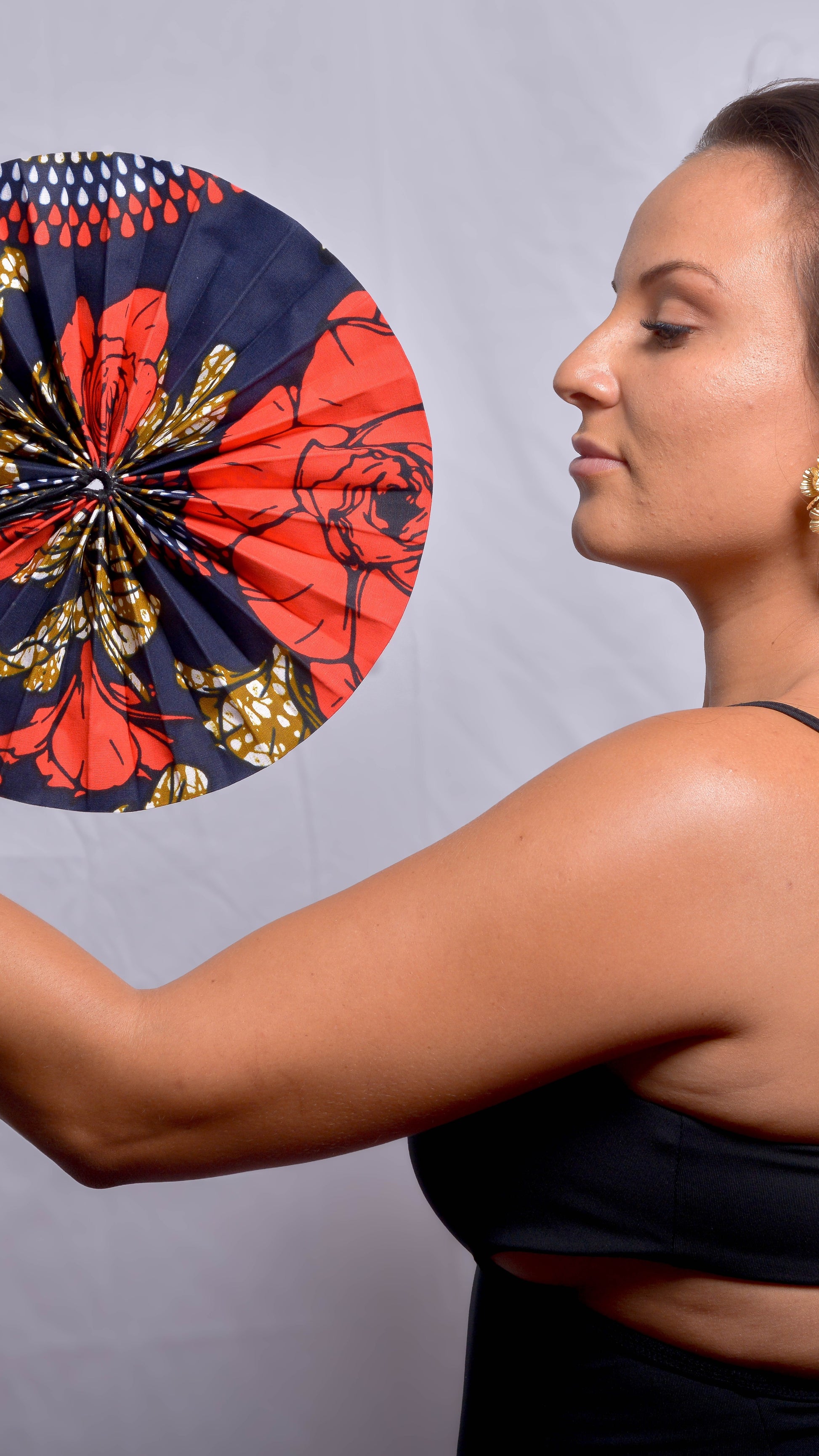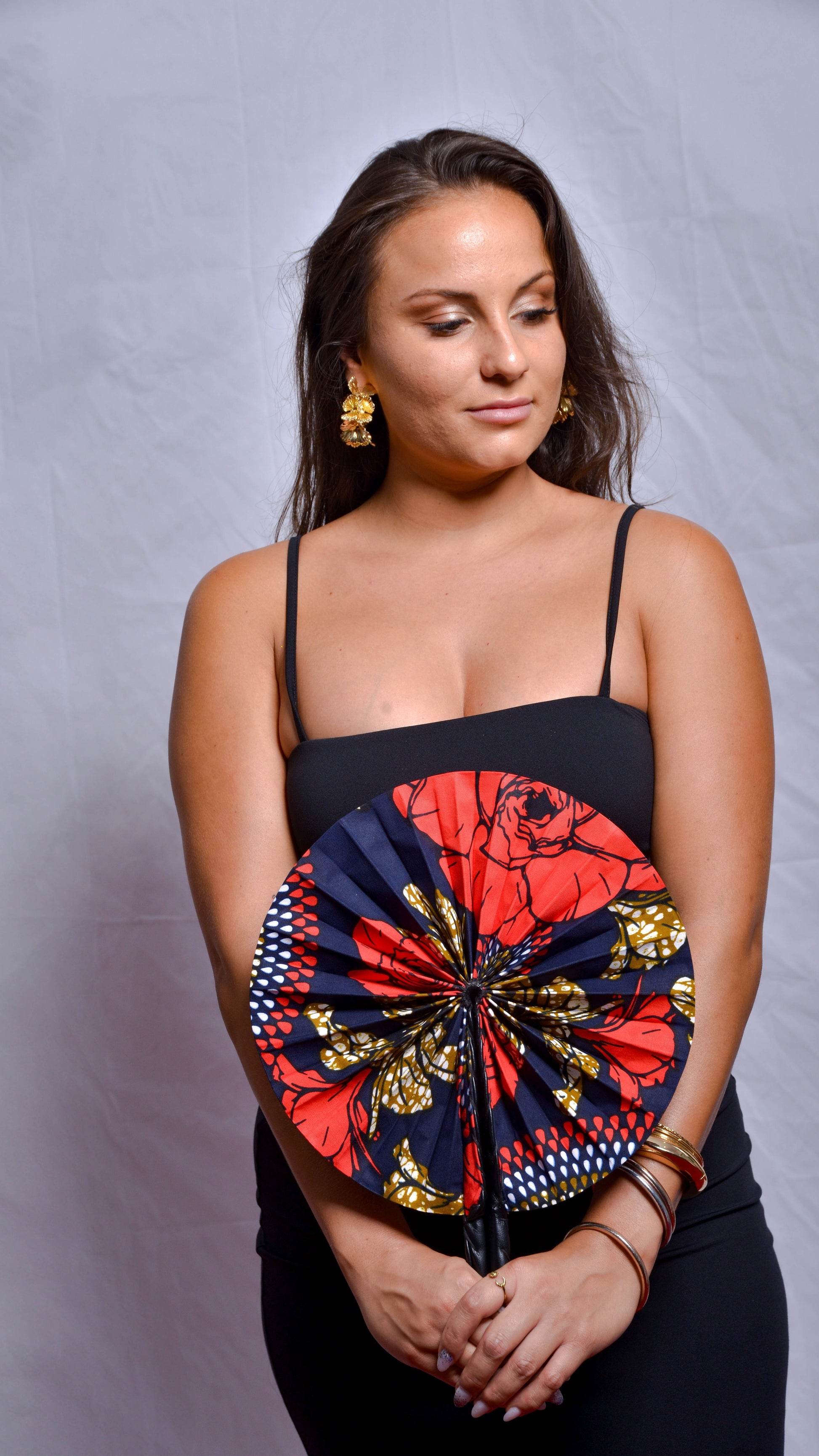 Drapé de noir profond, illuminé par des touches rouge ardent, d’or chaleureux et de blanc éclatant, cet éventail capture l’élégance d’une nuit africaine ponctuée de festivités. Ses motifs hypnotiques et floraux invitent au voyage et à l’évasion, évoquant la majesté et la force des terres lointaines. Entièrement fabriqué à la main avec un savoir-faire artisanal unique, il est issu d’une collection limitée et précieuse. Une pièce rare qui saura sublimer chacune de vos tenues et attirer tous les regards.